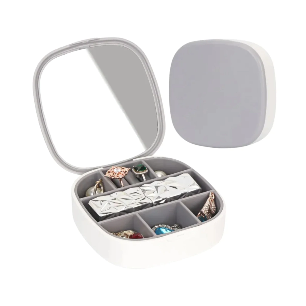 Este alhajero portátil es un aliado ideal para el cuidado y organización de tus joyas y accesorios. Su diseño compacto permite que sea fácilmente transportable, lo que lo convierte en la elección perfecta para llevar contigo en tus viajes, asegurando que cada pieza tenga su lugar.