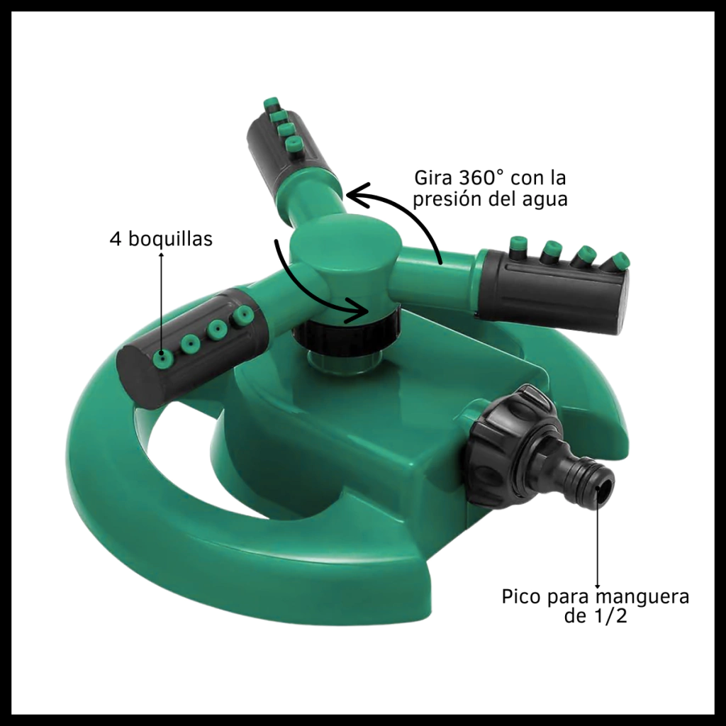 Fácil de usar y eficiente, una solución ideal para regar tu jardín de forma pareja, rápida y sin complicaciones. Sus tres brazos giratorios de 360° permiten una cobertura uniforme en distintas zonas. Es compatible con mangueras de ½ pulgadas.