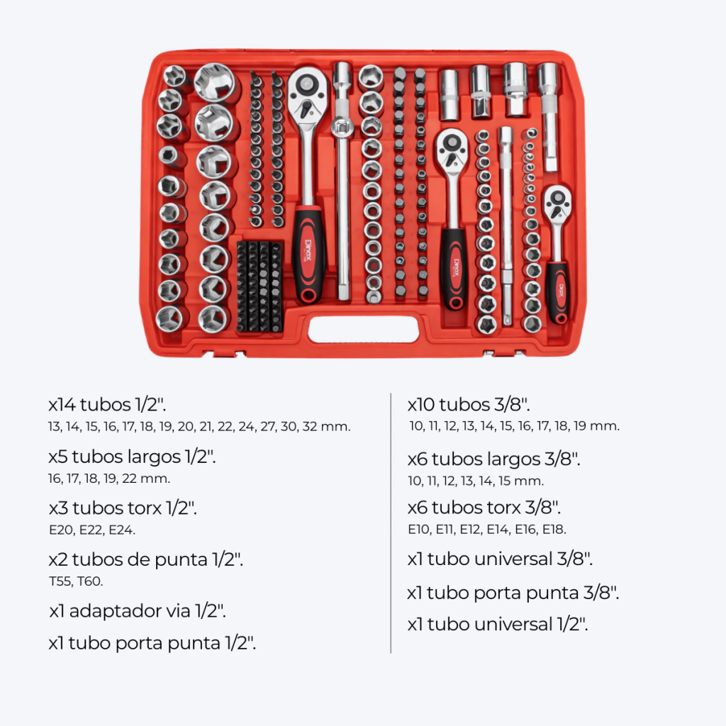 • Amplia compatibilidad: cuenta con encastres de 1/4", 3/8" y 1/2" que se adaptan a múltiples trabajos mecánicos y de mantenimiento.