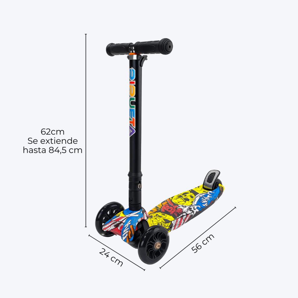 Este monopatín infantil es perfecto para que los chicos disfruten horas de diversión al aire libre. Liviano y fácil de transportar, se puede llevar al parque, la plaza o donde quieran jugar. Su manubrio ajustable y ruedas con luces LED brindan estabilidad y seguridad.