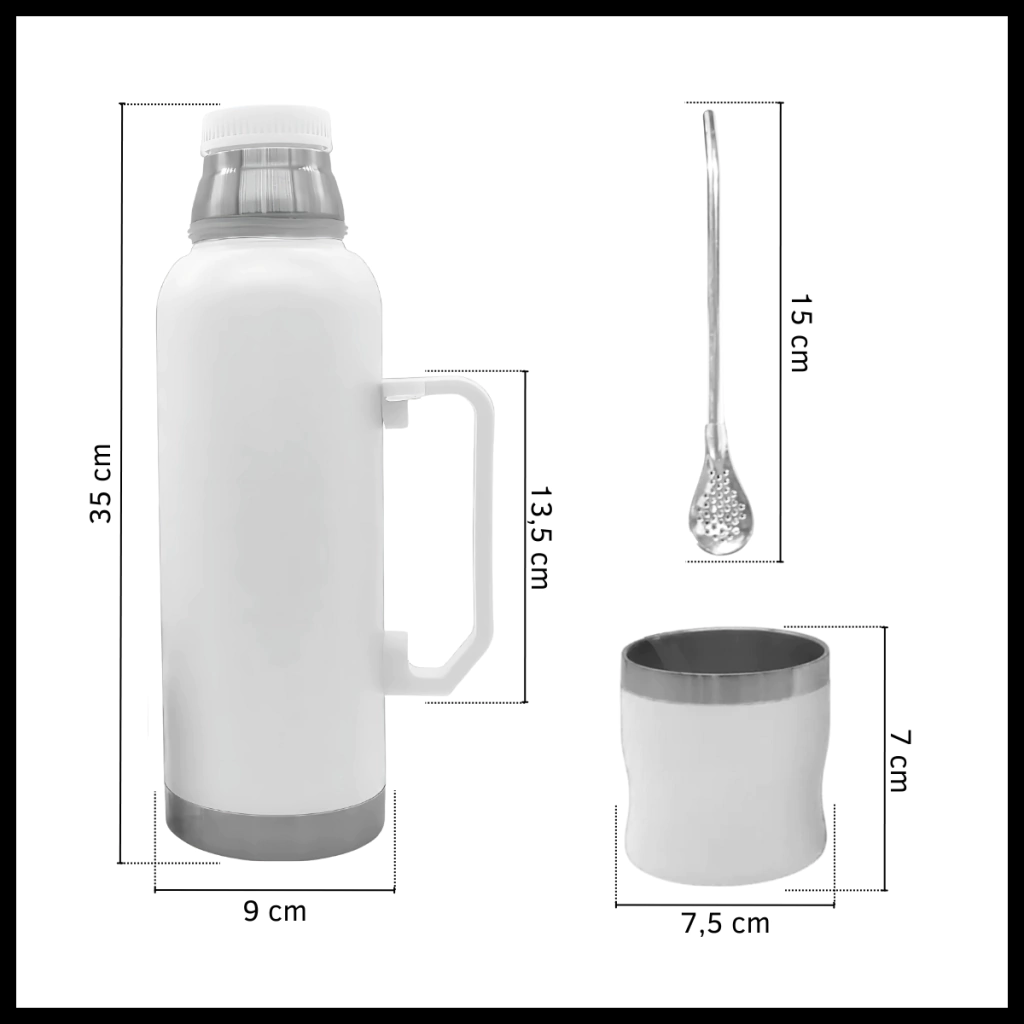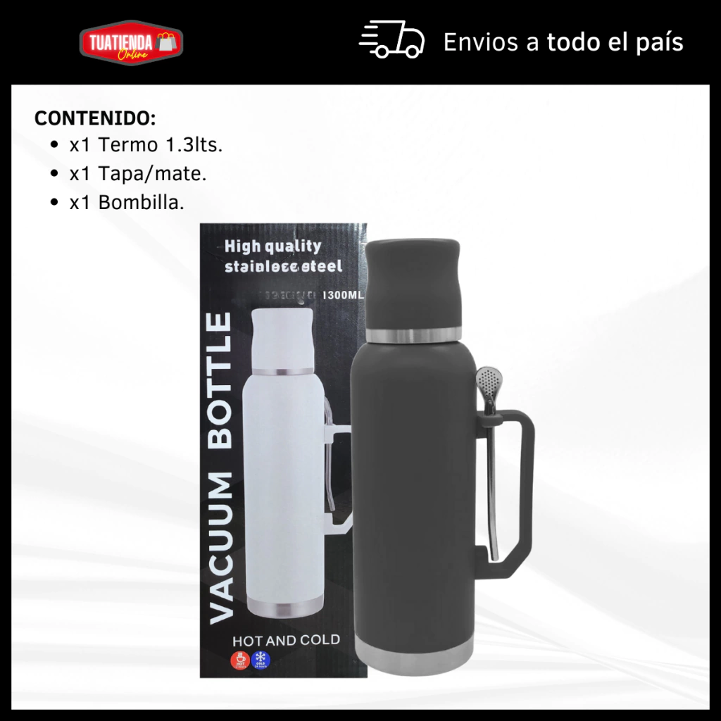 ¡Tu mate siempre listo, donde sea! Este termo de acero inoxidable de 1.3 litros tiene todo lo que necesitas: una tapa que se convierte en mate con bombilla, para que no te falte nada. Ideal para la oficina, paseos o aventuras al aire libre.